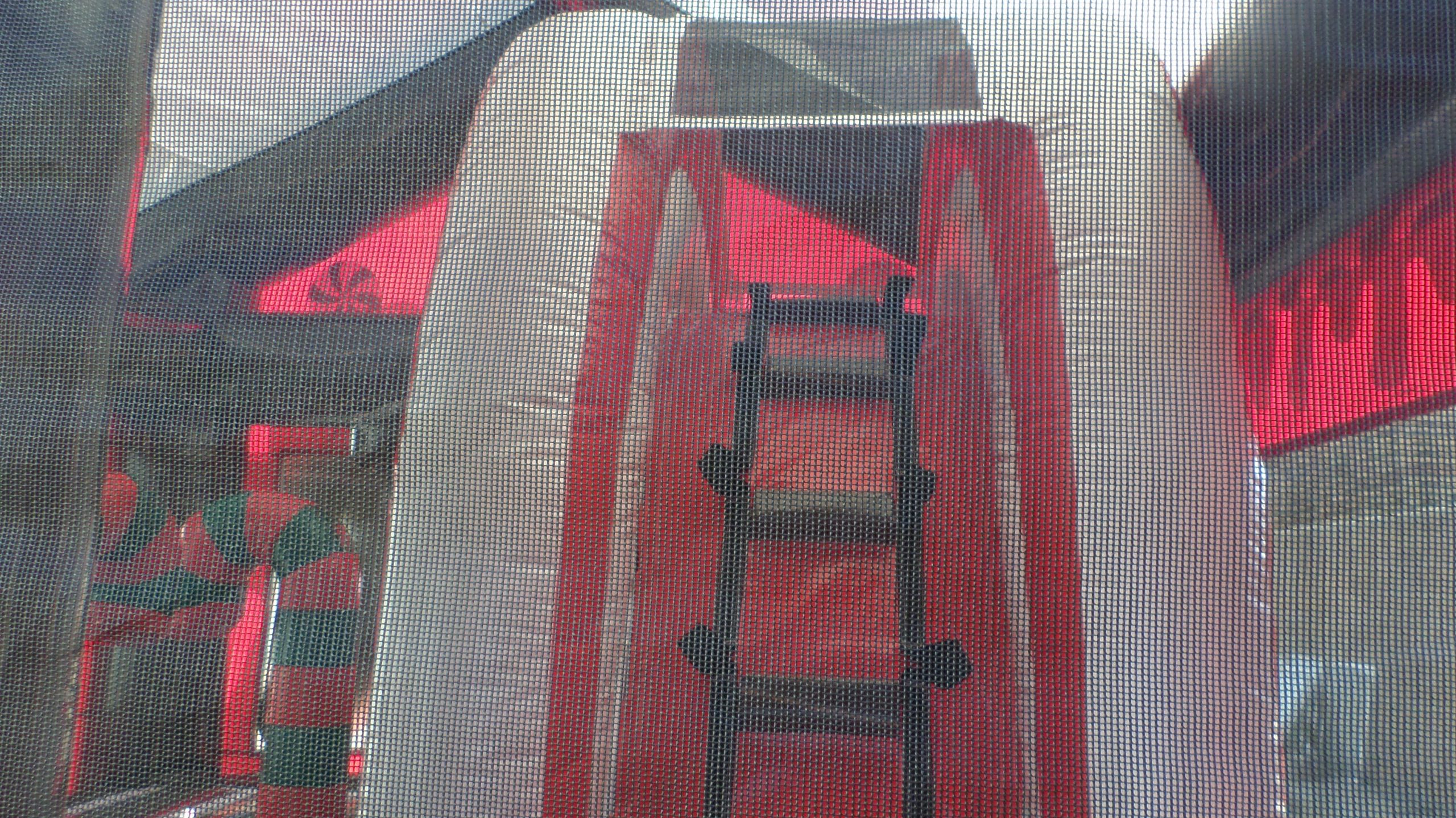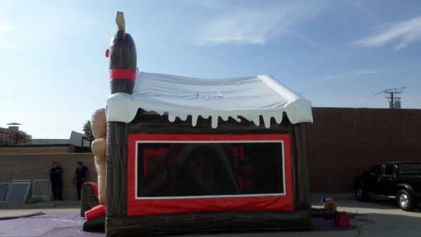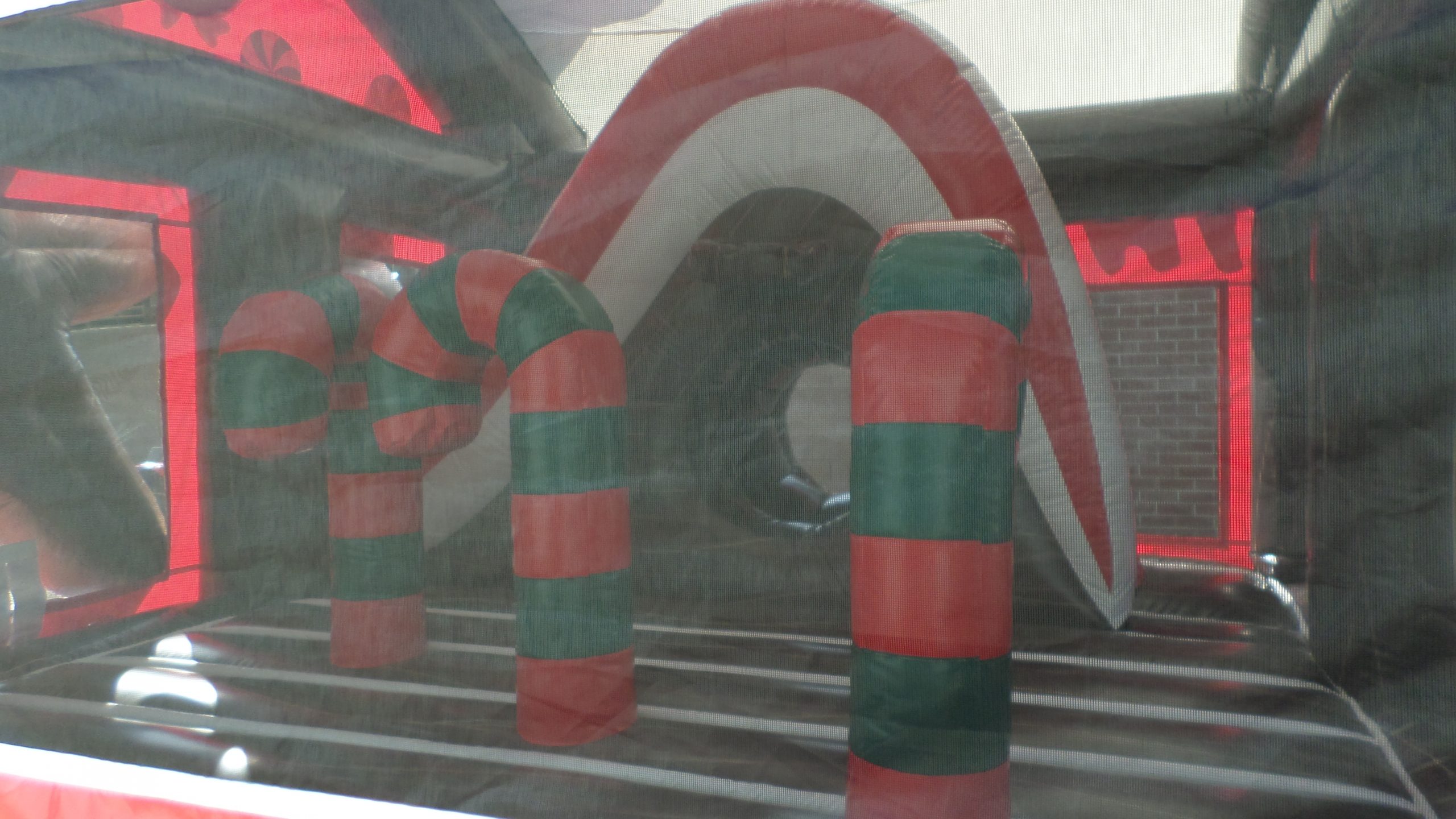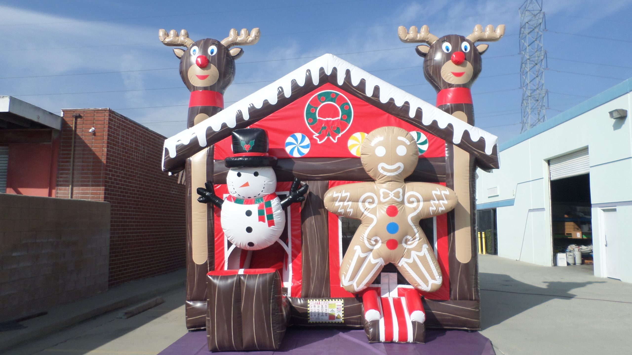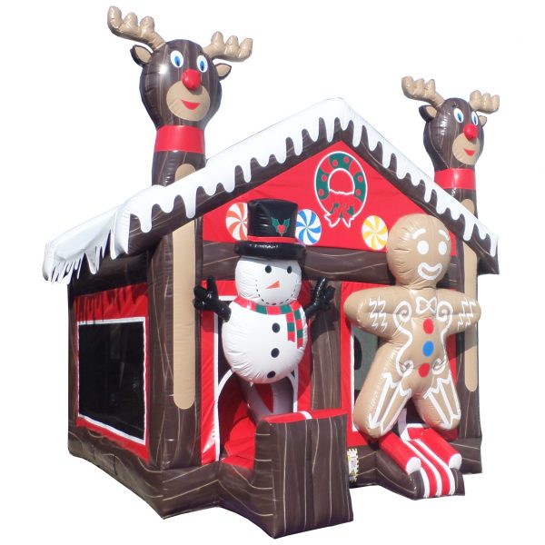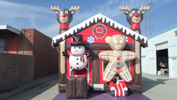 This inflatable is a Christmas themed 5 in 1 combo designed to look like a festive gingerbread house. There is a bright red and brown gingerbread style facade, two large reindeer on top, one on each side of the roof, a cheerful snowman and a big smiling gingerbread man at the front entrance. Decorative candy accents such as lollipops and peppermint swirls for extra holiday charm. A bounce area, climbing wall, slide, basketball hoop and obstacle pop ups such as candy canes inside are the elements of a 5 in 1 combo.