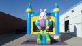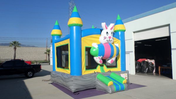 This beautiful Easter themed bounce house features bright blue, yellow and lime green castle style pillars and a fun, playful design that kids love. The front showcases a large inflatable bunny holding a colorful Easter egg, making it perfect for spring events, egg hunts or themed parties. It’s sturdy commercial grade construction provides a fun and safe experience for young children.
