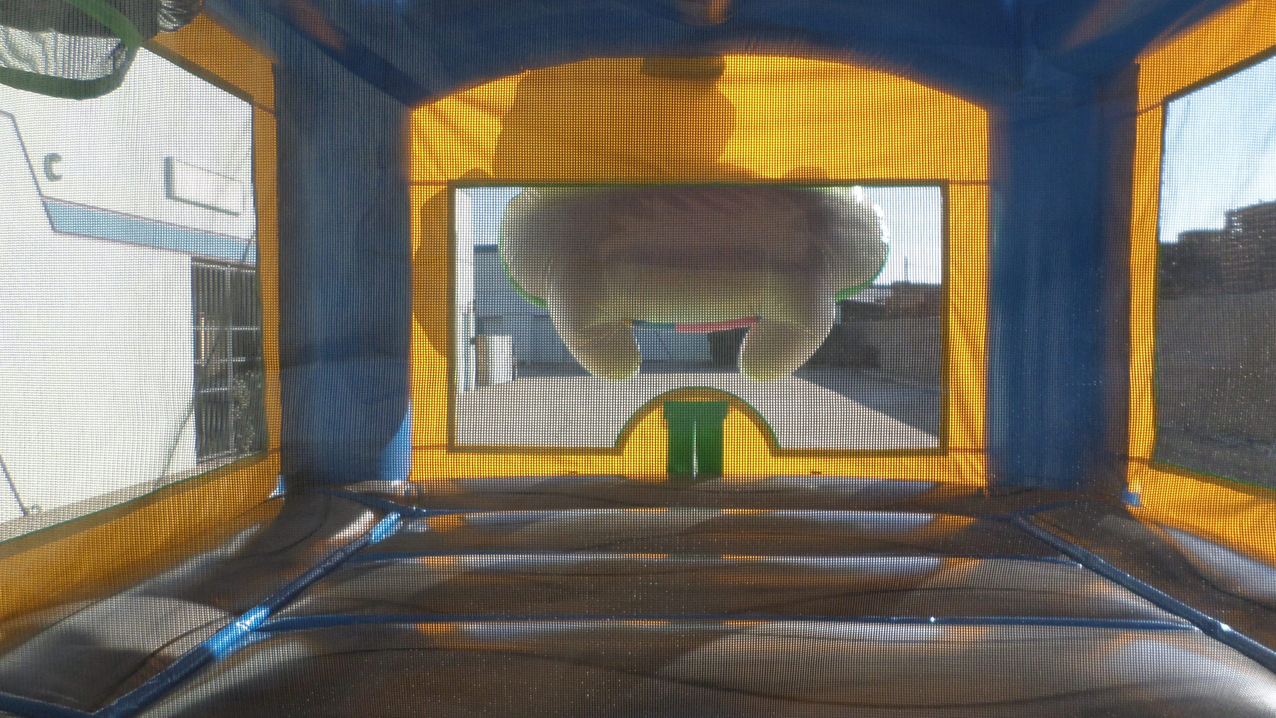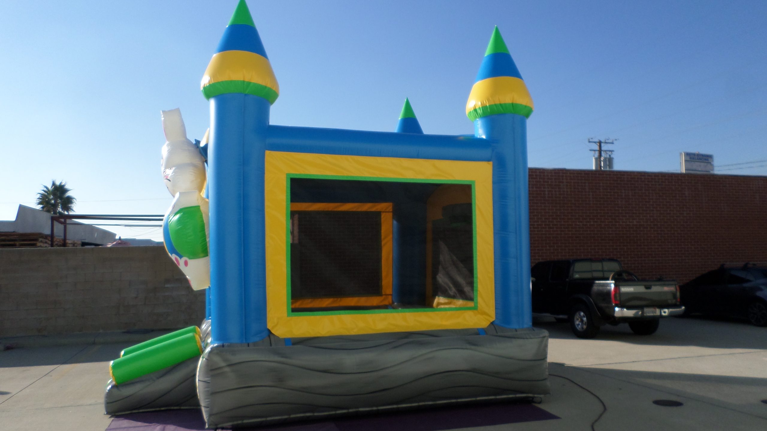 This beautiful Easter themed bounce house features bright blue, yellow and lime green castle style pillars and a fun, playful design that kids love. The front showcases a large inflatable bunny holding a colorful Easter egg, making it perfect for spring events, egg hunts or themed parties. It’s sturdy commercial grade construction provides a fun and safe experience for young children.
