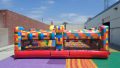 This is a large colorful inflatable playground designed for interactive play with multiple activities inside. Its bold, blocky pattern resembles a Lego style design, making it especially eye catching for children. Rather than just a bounce house or slide, this is a multi-activity play structure with various interactive elements like small obstacles, crawl spaces and slide. It has two separate access ramps/entrances for better crowd flow. Colorful block pattern gives it a “giant building blocks” look.