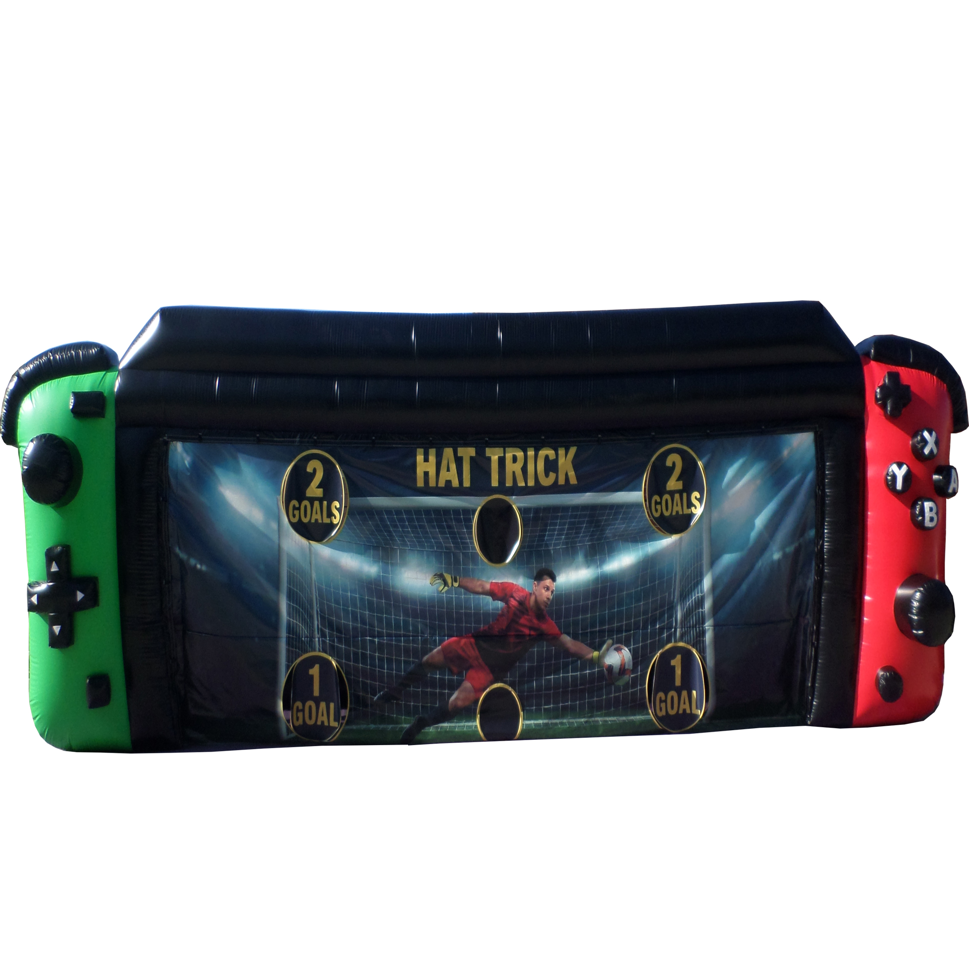 This large inflatable soccer shooting game features a realistic goalkeeper graphic and multiple target holes designed to test accuracy and skill. Players aim soccer balls at the marked goal openings, each labeled with point values like “1 Goal” and “2 Goals”, encouraging friendly competition and scorekeeping. The bold “Hat Trick” banner adds a professional stadium style look.